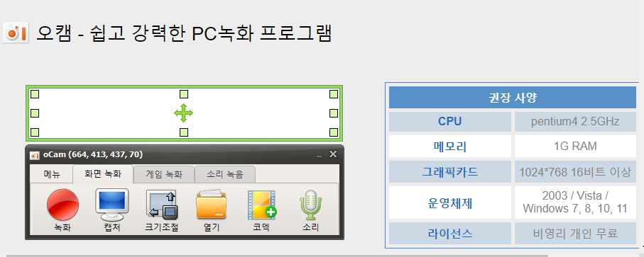 오캠(Ocam)은 화면 녹화 및 캡처 기능을 제공하는 프로그램입니다. 주로 다음과 같은 용도로 사용됩니다.